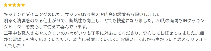 明るく清潔感のある仕上がりで、断熱性も向上し、とても快適になりました。70代の両親もIHクッキングヒーターを安心して使えて喜んでいます。